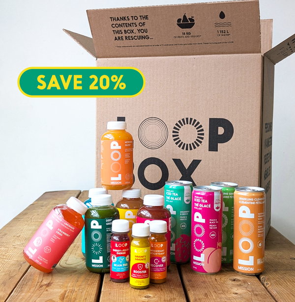 Packed with 20 delicious drinks, a reusable water bottle, and exclusive stickers, this is the perfect way to explore LOOP while fighting food waste.
