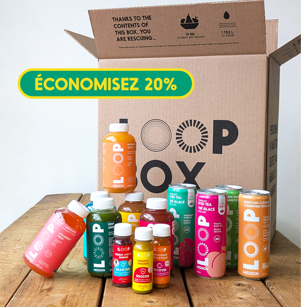 Remplie de 20 boissons incroyablement délicieuses, 1 bouteille d'eau réutilisable et 1 feuille d'autocollants exclusifs, c'est la manière parfaite de découvrir LOOP tout en luttant contre le gaspillage alimentaire.